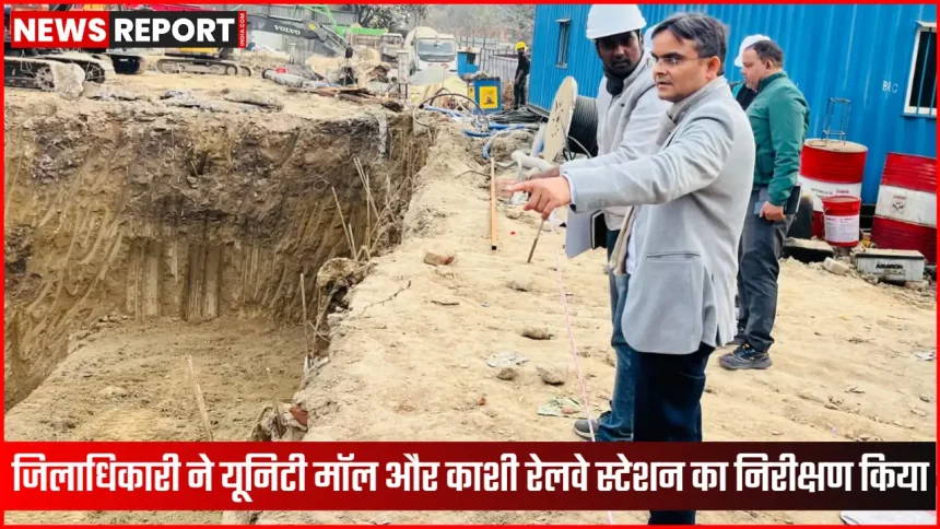 जिलाधिकारी सत्येन्द्र कुमार निर्माणाधीन यूनिटी मॉल और काशी रेलवे स्टेशन का निरीक्षण करते हुए