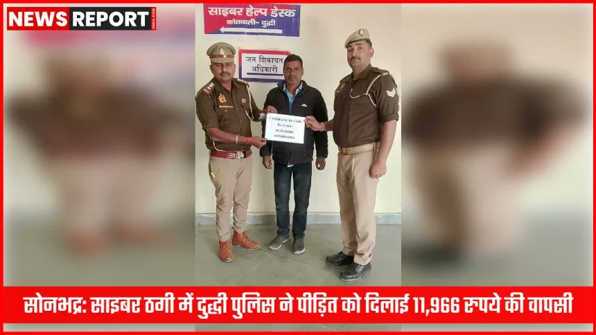 जनपद सोनभद्र में साइबर अपराध के मामलों पर प्रभावी कार्रवाई करते हुए दुद्धी पुलिस ने एक साइबर फ्रॉड पीड़ित को बड़ी राहत दिलाई है। पुलिस की त्वरित और समन्वित कार्यवाही से पीड़ित को ग्यारह हजार नौ सौ छियासठ रुपये बाइस पैसे की धनराशि सफलतापूर्वक वापस कराई गई। यह कार्रवाई साइबर अपराधियों के खिलाफ चलाए जा रहे विशेष अभियान के तहत की गई, जिसका उद्देश्य आम नागरिकों को डिजिटल ठगी से बचाना और पीड़ितों को न्याय दिलाना है।