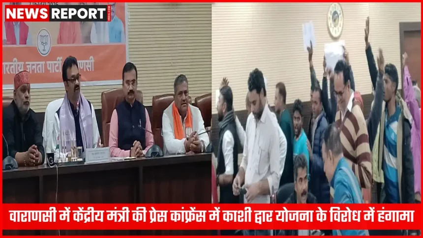 वाराणसी में शनिवार को उस समय अफरा तफरी की स्थिति बन गई जब केंद्रीय ग्रामीण विकास राज्य मंत्री कमलेश पासवान की प्रेस कांफ्रेंस के दौरान कुछ लोगों ने हंगामा कर दिया। यह प्रेस कांफ्रेंस शहर के सर्किट हाउस के सभागार में आयोजित की गई थी। हंगामा कर रहे लोग काशी द्वार योजना को रद्द करने की मांग कर रहे थे और उन्होंने हाथों में प्लेकार्ड लेकर विरोध प्रदर्शन किया। अचानक हुए इस घटनाक्रम से कुछ समय के लिए कार्यक्रम बाधित हो गया।